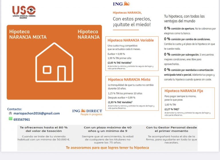 En virtud del acuerdo suscrito entre Nationale Nederlanden y el Sector Aéreo de la Unión Sindical Obrera os comunicamos que, a través del banco ING DIRECT facilitan a todos nuestros afiliados el acceso a una oferta muy interesante sobre Hipotecas