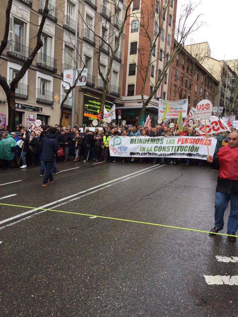 La manifestación de hoy en Madrid convocada por la MERP,  ha sido seguida por una multitud de pensionistas a pesar de las inclemencias del tiempo.